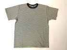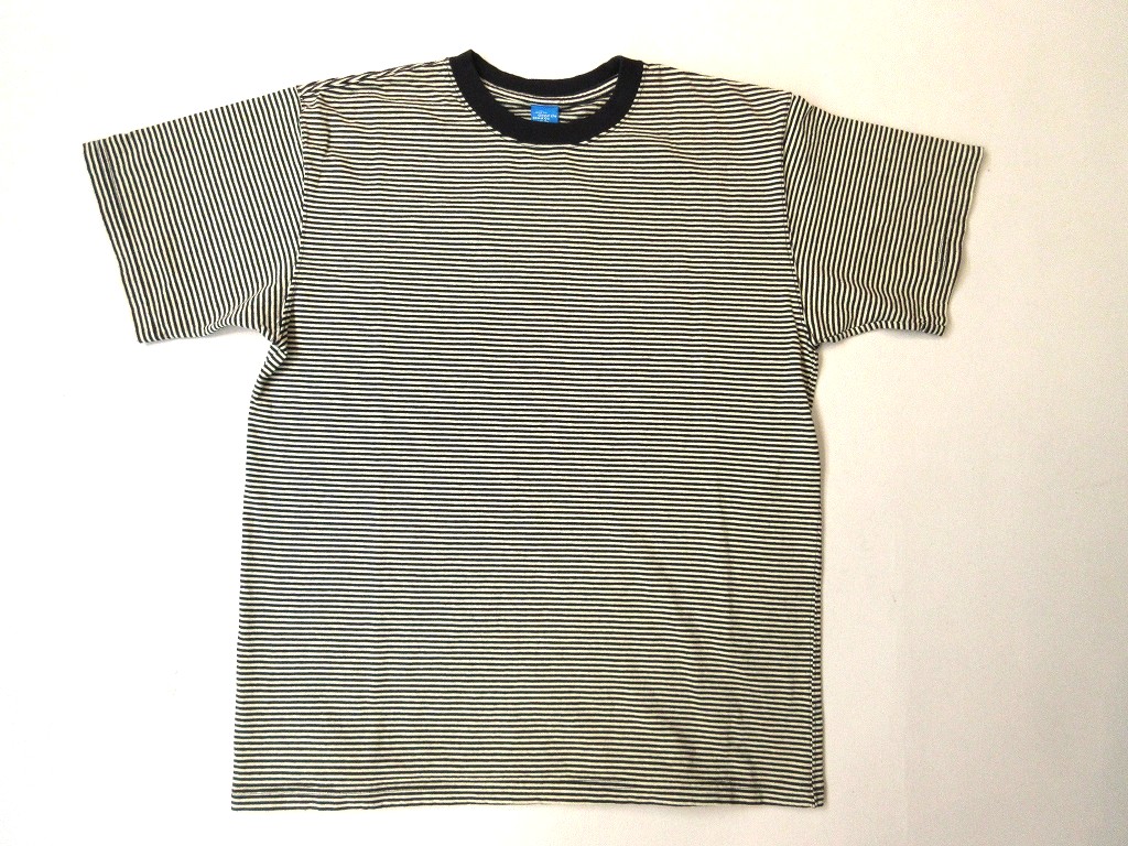 綿100%の5.5オンスジャージーを細幅のストライプ柄にアレンジして編み上げ、縫製後に製品染めを施したボーダーTシャツです。